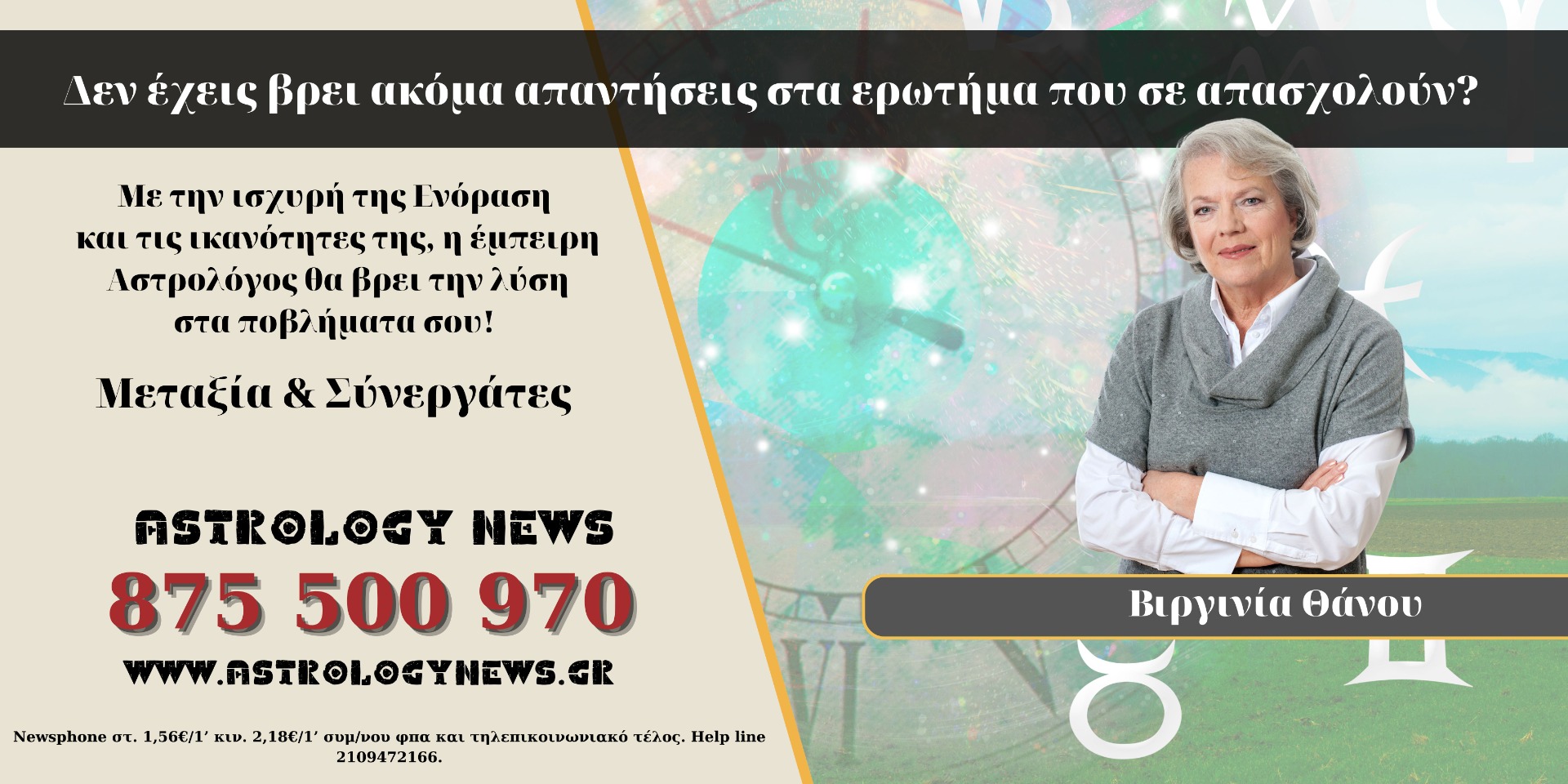 Δώσε τέλος στα ερωτήματα που σε βασανίζουν. Έγκυρες προβλέψεις χωρίς αναμονές. Στην Μέντιουμ-Αστρολογική γραμμή θα βρεις τις απαντήσεις που ψάχνεις.